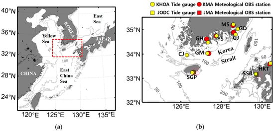 (a) The red dashed rectangle represents the study area covering the Korea Strait between the Yellow Sea, East China Sea, and East Sea. (b) Observation stations for atmospheric pressure (red) and sea level (yellow) in the Korea Strait. CJ, SGP, GM, GH, YS, GJ, GD, MS, SSB, and HKT stand for Chujakdo, Seogwipo, Geomundo, Goheung, Yeosu, Geojedo, Gadeokdo, Masan, Sasebo, and Hakata, respectively. Contours represent the bottom topography (m). Jeju Island and Tsushima Island are located at 126.8° E, 33.4° N and 129.5° E, 34.5° N, respectively, in the Korea Strait. MS is located in Jinhae-Masan Bay (128.4–128.8° E, 34.9–35.3° N).