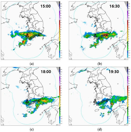 Rainfall intensity (mm/h) estimated from rainfall radar at (a) 15:00, (b) 16:30, (c) 18:00, and (d) 19:30 on 7 April 2019.