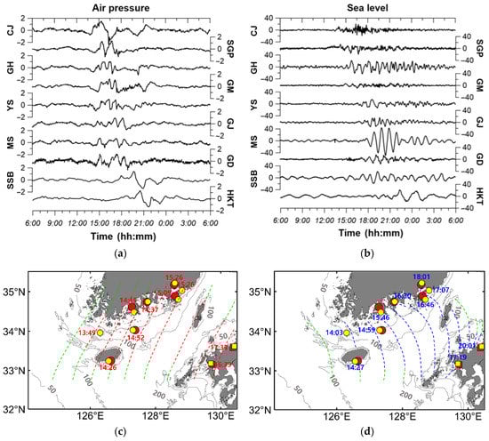 Variations of (a) atmospheric pressure (hPa) and (b) sea levels (cm), which were high-pass-filtered with a cutoff period of 180 min. (c) Arrival times (hour:minute) of atmospheric pressure disturbances and (d) the long ocean waves (meteotsunami) along the Korea Strait on 7 April 2019. The contour intervals are 30 min. The dashed green contour lines in (c,d) are the extrapolated locations of atmospheric pressure disturbance and long ocean wave, respectively, based on the patterns of nearby observation data.