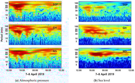Wavelet spectrum of (a) atmospheric pressure and (b) sea level time series at the SGP, GH, and MS stations from 12:00 on 7 April to 12:00 on 8 April 2019.