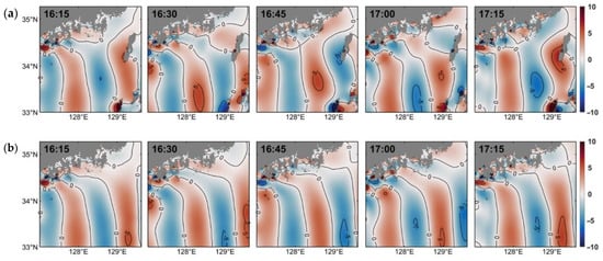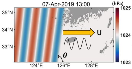 On 7 April 2019, convective rain clouds were observed moving from west to east in the Korea Strait (Figure 2). A zonal band of rain clouds moved eastward along the northern coast of the Korea Strait, and a southern branch of rain clouds to the west of Jeju Island headed toward the island at 15:00 on 7 April. Atmospheric pressure disturbances propagated ahead of the southern branch of rain clouds (Figure 2 and Figure 3). It could be observed that the atmospheric pressure jumps were tilted spatially, and the titling angle was approximately 80° counterclockwise due east (Figure 3). The trains of atmospheric pressure disturbances arrived at CJ at 13:49 on 7 April, and moved over SGP, GM, and MS at 14:29, 14:50, and 15:46, respectively (Figure 3a,c and Table 1). The arrival times of the atmospheric pressure disturbances were defined as the time of the lowest elevation point of the first anomaly peak. The movement angle and time were spatially inferred using the arrival time of the atmospheric pressure disturbances at each station (red dashed line in Figure 3c). The line of atmospheric pressure jumps was inclined at approximately 75–83° counterclockwise due east in the Korea Strait. The angle gradually increased as it moved from west to east, because the eastward-moving speed of atmospheric pressure disturbances was faster in the south than the north from 13:30 to 14:30 on 7 April (Figure 2 and Figure 3c). Once the disturbances passed the GH and GM stations, the angle was maintained at 75–80°. The speeds of the atmospheric pressure disturbances were calculated using differences in the arrival times and distances between each station in the east–west direction based on the observed data. The speeds of the atmospheric pressure disturbances along the northern coastal stations (GH–GD), central stations (CJ–GM), and southern stations (SGP–HKT) of the Korea Strait were approximately 31.0, 26.5, and 30.4 m/s, respectively (Figure 3c and Table 1). The height of atmospheric pressure disturbances from trough to crest was approximately 1.5–3.9 hPa (Table 1). Atmospheric pressure disturbances consisting of two to four waves moved eastward along the Korea Strait (Figure 3a).