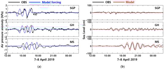 Comparison of (a) atmospheric pressure anomalies and (b) sea level variations from observations and numerical simulations at SGP, GH, and MS from 12:00 on 7 April to 06:00 on 8 April 2019.