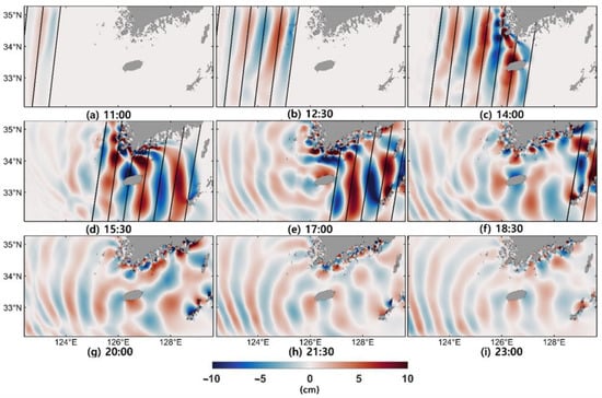 Spatial distribution of modeled sea level elevation (colors) in the Yellow Sea and Korea Strait every 1.5 h from 11:00 to 23:00 on 7 April 2019. Colors represent sea level anomalies. Black straight lines represent 1024 hPa isobars in atmospheric pressure that propagate eastward (Figure 5).