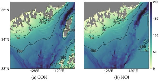 Spatial distributions of bottom depth (m) for (a) the control (CON) experiment and (b) no offshore islands (NOI) experiment. The contour intervals of the isobaths are 50 m.