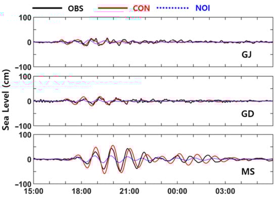 To examine the role of the refracted and reflected waves on sea level variation in Jinhae-Masan Bay, sea level variations from the numerical simulations were compared with the observed sea level variations at GJ, GD, and MS (Figure 10). The sea level oscillations in the CON experiment started at 16:46, 17:05, and 17:48 at GJ, GD, and MS, respectively. The sea level oscillations in the NOI experiment started at 16:38, 16:57, and 17:40, respectively, which were 8 min earlier than those in the CON experiment. When the amplitudes of sea level oscillations were compared over 6 h from the beginning of the long wave event, the wave amplitudes at GJ, GD, and MS were 34.2%, 67.8%, and 72.7% larger in the CON experiment than those in the NOI experiment, respectively. The numerical experiments revealed that the refraction and reflection of waves by the offshore island and bottom topography affect amplitudes and arrival times of the long wave in Jinhae-Masan Bay. In [15], it is suggested that the interaction between long waves and tides in the Yellow Sea affects the arrival time and amplitude of long ocean waves. Therefore, the interaction between long waves and tides may need to be considered to increase the accuracy in the prediction of amplitudes and arrival times of long ocean waves in the Korea Strait.