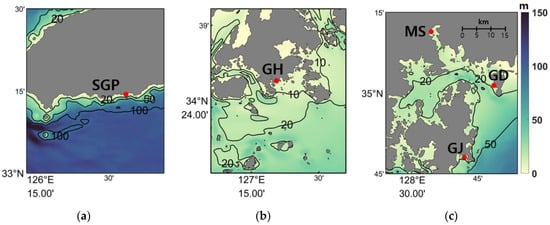 Enlarged topographic maps of the (a) SGP, (b) GH, and (c) MS tide observation stations. Colors represent bottom depths in meter. The bottom topography is contoured at depths of 10, 20, 50 and 100 m.