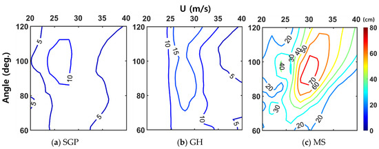 Expected amplitudes (cm) of the long ocean waves at (a) SGP, (b) GH, and (c) MS in the Korea Strait if an atmospheric pressure disturbance propagated eastward with various isobar angles (θ in Figure 5) and traveling speeds () from 20 to 40 m/s.