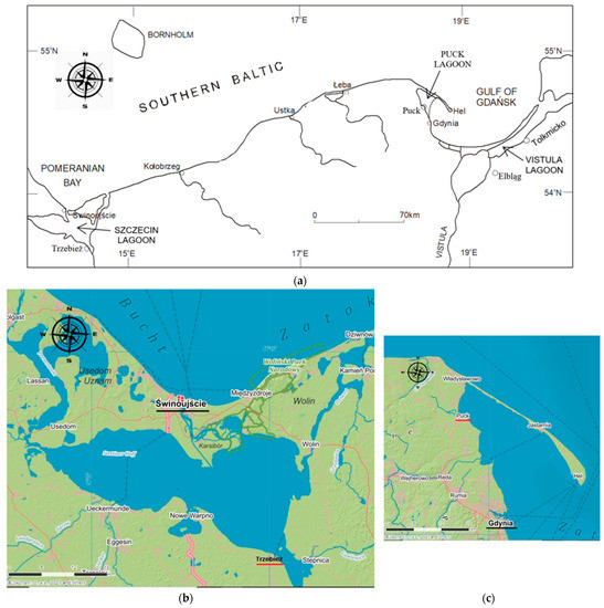 Southern Baltic coastal lagoons are important basins for the maritime economy. These basins are crossed by shipping lanes leading to large ports: to Police, Stepnica and Szczecin via Zalew Szczeciński; to Puck, Kuźnica and Jastarnia via Puck Lagoon, and to Baltiysk, Kaliningrad, and Elbląg via Vistula Lagoon. In addition to the ports mentioned above, situated along the coasts of the lagoons are numerous smaller harbors, mostly fishing ports and marinas. The lagoons are sheltered basins, separated from the sea by islands (Szczecin Lagoon) or spits (Puck Lagoon and Vistula Lagoon). Only Puck Lagoon is in direct contact with marine waters via the Gulf of Gdańsk. The remaining lagoons are linked to the sea via channels. In the present paper, the inner part of Puck Bay (which is the western part of the Gulf of Gdańsk) is termed Puck Lagoon due to the considerable shallowing of Rewa Mewia (in some papers referred to as Seagull Shallow or Mewia Shallow), protruding toward the SW from Hel Peninsula, and Rewa Cape, protruding from the mainland coast toward the NE opposite the Seagull Shallow. Rewa Mewia is an elongated shoal, only about 1 m deep along its whole length, and in some places (especially close to the shore), it is entirely emerged.