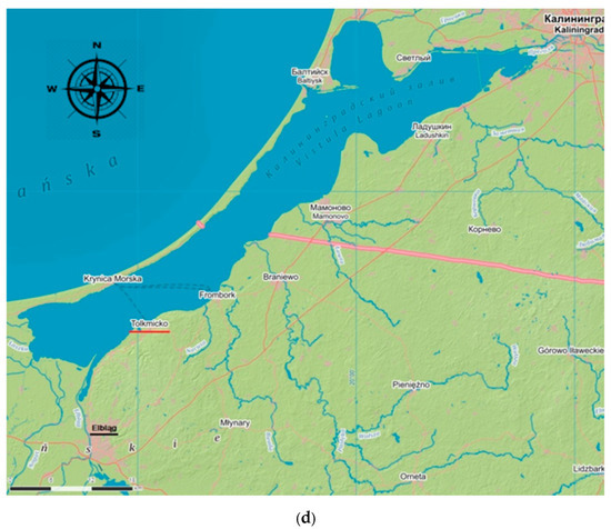 (a) Location of coastal lagoons on the southern Baltic Sea coast; and maps of (b) Szczecin Lagoon; (c) Puck Lagoon; and (d) Vistula Lagoon. In figure (a) the dotted line marks the border of the Puck Lagoon. In figures (b–d) the black line underline weather stations and the red lines show ice monitoring stations, the pink line marks the state border. Source of maps (b–d): https://en.mapy.cz/, accessed on 14 July 2021, maps were slightly modified by authors.