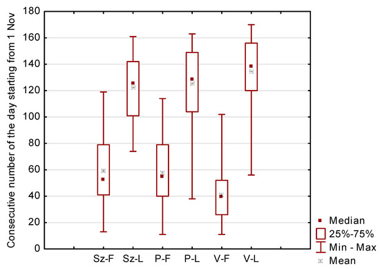 Box and whisker plots, presenting descriptive measures for first ice (F) and last ice (L) on Szczecin Lagoon (Sz–F and Sz–L, respectively), Puck Lagoon (P–F and P–L, respectively), and Vistula Lagoon (V–F and V–L, respectively) through the period 1950/51–2019/20. Boxes indicate the positions of the lower and upper quartile, and whiskers represent the maximum and minimum values of ice parameters. Consecutive day numbers (with 1 Nov as day 1) are given instead of dates.