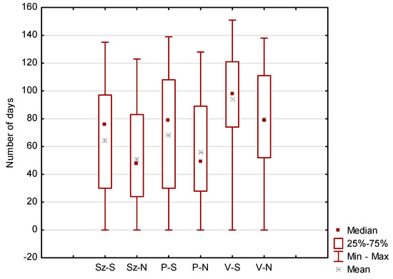 Box and whisker plots, presenting descriptive measures for ice season duration (S) and the number of days with ice (N) on Szczecin Lagoon (Sz–S and Sz–N, respectively), Puck Lagoon (P–S and P–N, respectively), and Vistula Lagoon (V–S and V–N, respectively) through the period 1950/51–2019/20. Boxes indicate the positions of the lower and upper quartile, and whiskers represent the maximum and minimum values of ice parameters.