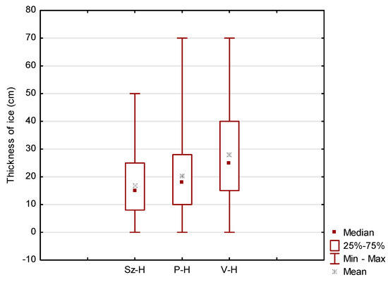 Box and whisker plot, presenting descriptive measures for maximum ice thickness in season (H) on Szczecin Lagoon (Sz–H), Puck Lagoon (P–H), and Vistula Lagoon (V–H) through the period 1950/51–2019/20. Boxes indicate the positions of the lower and upper quartile, and whiskers represent the maximum and minimum values of ice parameters.