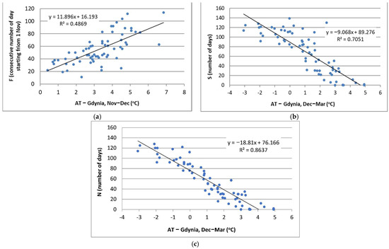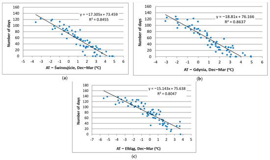 Correlations between the number of days with ice (N) on (a) Szczecin Lagoon; (b) Puck Lagoon; (c) Vistula Lagoon, with winter (Dec–Mar) air temperatures (ATs) through the period 1950/51–2019/20, along with the regression line equation and determination coefficient (R2).