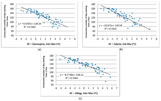 Correlations between the date of the last ice disappearance (L) on (a) Szczecin Lagoon; (b) Puck Lagoon; (c) Vistula Lagoon, with Feb–Mar air temperatures (ATs) through the period 1950/51–2019/20, along with the regression line equation and determination coefficient (R2).
