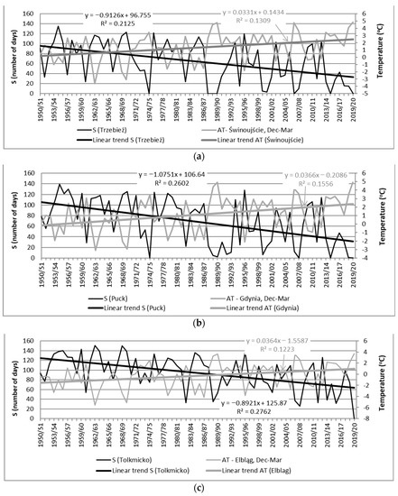 Variations and trend lines for ice season duration (S) on (a) Szczecin Lagoon; (b) Puck Lagoon; (c) Vistula Lagoon, and winter (Dec–Mar) air temperature (AT), along with the regression line equation and determination coefficient R2 (AT data span 1950/51–2019/20).