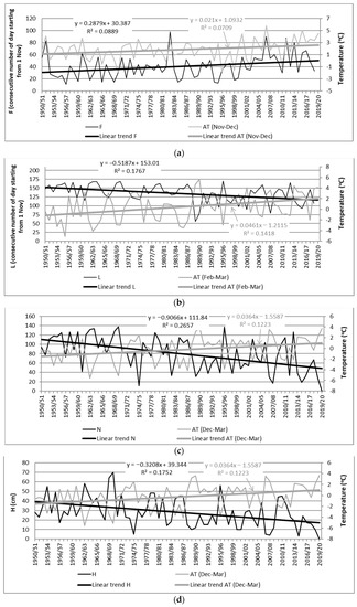 Variations and trend lines for: (a) first ice occurrence (F); (b) last ice disappearance (L); (c) the number of days with ice (N); (d) maximum ice thickness (H) on Vistula Lagoon, and air temperature (AT) from selected months (Nov–Dec, Feb–Mar, and DecMar), along with the regression line equations and determination coefficient R2 through the period 1950/51–2019/20.