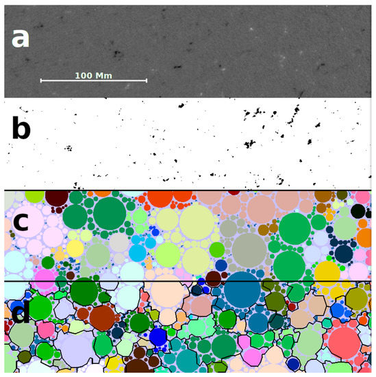 - Hagenaar, H.J.; Schrijver, C.J.; Title, A.M. The Distribution of Cell Sizes of the Solar Chromospheric Network. Astrophys. J. 1997, 481, 988–995. [Google Scholar] [CrossRef]