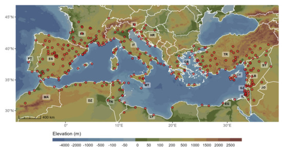 Geographical location map of meteorological stations with continuous monthly precipitation and temperature records in the Mediterranean Basin (MED) over the 1975–2019 period.