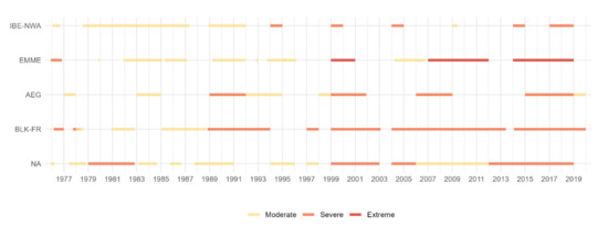 Based on the analysis of the DXI-12, a new dataset of meteorological drought events was constructed during the period between 1975 and 2019. The overall number of drought events is 375, 169 of which occurred after 1996 at the country level. Any drought event that involved more than one country was allocated to represent its subregion. At the subregional scale, 19 drought events are detected in IBE–NWA, whereas the dataset has reported 20, 13, 13 and 15 drought events in EMME, AEG, BLK–FR and NA, respectively. The spatiotemporal characteristics of each drought event, including its duration, severity, intensity, areal extent and area involved with peak were examined at the country and subregional scales. Considering that the area affected by drought is a very important drought characteristic to evaluate the drought risk, we first reported the widest drought events in each region that hit more than one country with a peak regional area that exceeded 50% (Table 4). The corresponding Degree of Dryness (DDI) values for the peak year for each drought event at the subregional scale are also presented.