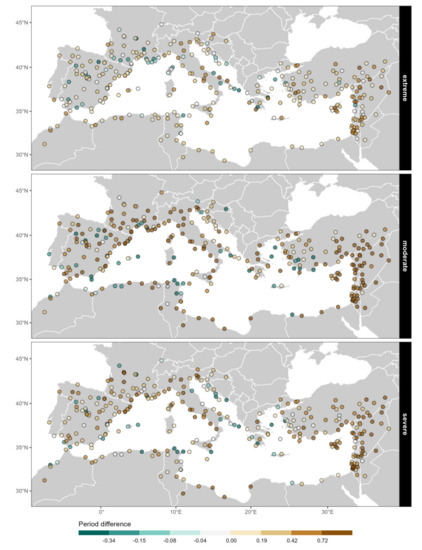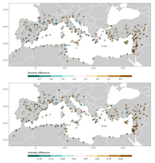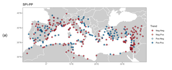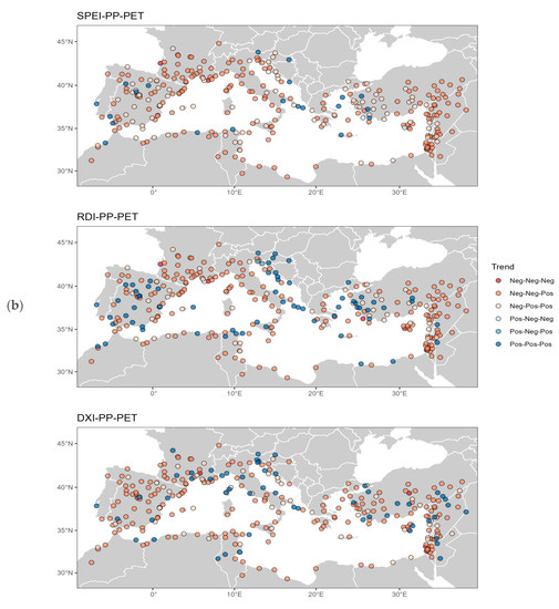 Thus, drought occurrence has shown an increasing trend in addition to more prolonged and frequent periods, in last two decades, at the regional level (Table 8). The change in drought event frequency was also assessed according to the SPI, SPEI-12 and RDI-12 between the subperiods 1975–1996 and 1997–2019 (Figure 7). An overall increase in the frequency of dry spells appears over the MED for all the combinations of SPI-12, SPEI-12 and RDI-12 during 1997–2019, with clear spatial patterns, suggesting that droughts were more frequent in the last two decades. Based on the SPI-12, SPEI-12 and RDI-12, the results indicated that 70%, 96% and 84% of the total stations have reported an increase in the frequency of drought periods during 1996–2019, respectively (Figure 7).