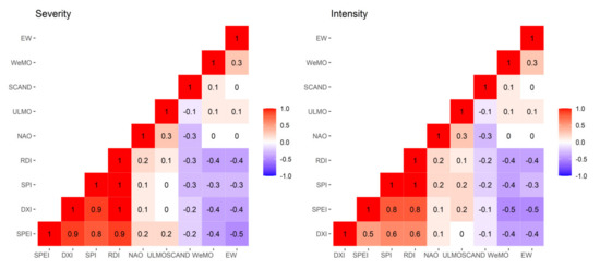 Values of the matrix correlation of drought severity and intensity identified by SPI-12, SPEI-12, RDI-12 and DXI-12, and the ATPs over the MED. (Values greater than or equal to the absolute value of 0.3 are significant.).