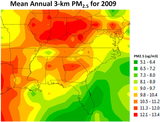 Figure 1 illustrates the annual average PM2.5 concentration levels for the 12-state region where all the participants in the Southern Community Cohort Study resided in 2009. The average annual PM2.5 concentrations vary considerably over the 12-state Southern Region of the United States. With the highest concentration levels observed in the northern parts of Georgia, Mississippi, and Alabama, along with various specific locations in many of the other study region states (e.g., Tennessee, Kentucky, and the Carolinas).