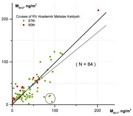 In order to justify the joint use of the data from two methods, we compared the measurements of black carbon concentrations, performed by collecting samples on the filters (designated as MBC1) and using an MDA aethalometer (designated as MBC2). The comparative analysis was carried out using the results from parallel (simultaneous) measurements of the concentrations MBC1 and MBC2 in 67th and 80th cruises of RV “Akademik Mstislav Keldysh”.