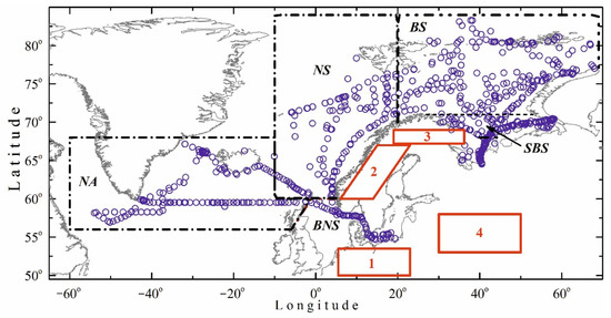 Table 2 presents information on 21 expeditions, in which the black carbon concentrations were measured by any (MDA or Samples) method. The routes of the marine expeditions are shown in Figure 2. The dash-dotted line in the figure denotes five areas for which the statistical characteristics of MBC were calculated: (1) Baltic and North Seas (denoted as BNS); (2) North Atlantic (NA); (3) Norwegian Sea (NS); (4) Barents Sea (BS); and (5) South of the Barents Sea (SBS). We clarify the boundaries of the identified regions: from 60° N in the north and up to 0° E in the west for BNS; from 56° to 66.6° N and up to 0°/−10° W in the east for NA; from 10° W to 20° E and northward of 60° N for NS; from 20° E to Novaya Zemlya and northward of 71° N for BS; and from 68° to 71° N for SBS. The expedition measurements were conducted from May to October. Most (83%) of the data were obtained in the period from July to September (Figure 3).