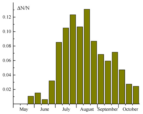 Histogram of the distribution of the relative amount of measurement data in different months.