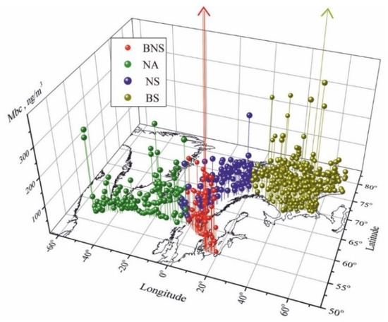 Variations in black carbon concentrations in different regions: BNS—Baltic and North Seas; NA—North Atlantic; NS—Norwegian Sea; BS—Barents Sea.