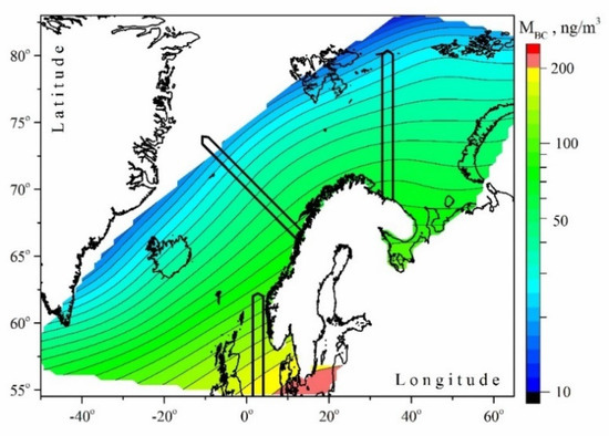 Figure 4 gives a general idea of how black carbon concentrations vary in different marine regions. It can be clearly seen that the concentrations and the MBC variations are larger over the Baltic, North Seas, and in the south of the Barents Sea. Figure 5 presents the average latitude-longitude distribution of black carbon concentrations, plotted using the method of Thin Plate Spline (TPS) interpolation [43]. From the figure it can be seen that the concentrations MBC decrease from ~220 ng/m3 in the southern part of the North and Baltic Seas to the values less than 50 ng/m3 in the northern regions of the ocean. In addition to the tendency of decreasing the concentration MBC with latitude, the factor of continental impact has been well manifested. In particular, owing to its proximity to the Kola Peninsula, the concentrations MBC in the south of the Barents Sea (68°–71° N) turned out to be the same as in the middle part of the North Atlantic at more southern latitudes (<57° N). Evidently, the increased MBC values in coastal regions are explained by their proximity to the continental sources of black carbon emissions in conjunction with the heavier ship traffic. On the whole, the spatial distribution is characterized by decreased concentrations of MBC in the northwestern direction. The gradients of decreasing concentrations with the growing distance from the land in three sectors of the ocean will be considered in more detail in Section 3.3.
