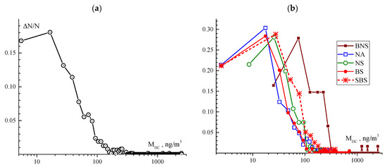 From the frequency histograms (Figure 6a) it can be seen that the most part (>90%) of the MBC values in the total dataset is concentrated in the range up to 120 ng/m3. In nine cases (1.3% of the total number), the black carbon concentrations have values of 300–2500 ng/m3, which are characteristic of continental and urban regions. The black carbon concentrations in excess of 300 ng/m3 were obtained in the water basins of the North and Baltic Seas, surrounded by densely populated and industrially developed European countries, as well as in the Barents Sea.
