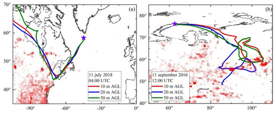 Back trajectories of air mass motion to the measurement sites (stars) at heights of 10, 20 and 50 m above ground level (AGL) in the situations on 11 July 2018 in the North Atlantic (a) and 11 September 2016 in the northeastern part of the Barents Sea (b); red dots indicate fire centers (temperature anomalies).