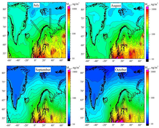 From Figure 8 it can be seen that the black carbon concentrations in all months decrease in a northern or northwestern direction. In addition to this common regularity, we can clearly discern the difference in the spatial MBC distributions when going from summer (July–August) to the fall (September–October). During summer, the region of relatively high concentrations of MBC (more than 70–100 ng/m3) encompasses a vast territory of ocean up to 70–75° N. During the fall, the contour lines of the concentrations shift in the southeastern direction (toward continent); and in certain regions there are changes in the gradients of decreasing concentrations of MBC with an increasing distance from the land.