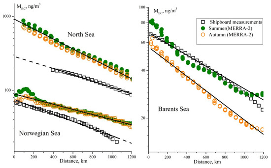 To obtain quantitative estimates, we analyzed changes in the concentrations of MBC in a direction away from the land at a distance of 1200 km in three regions (indicated by black arrows in Figure 5 and Figure 8): (a) over the North Sea in the northern direction; (b) over the Norwegian Sea in the northwestern direction; and (c) over the Barents Sea in the northern direction. Figure 9 shows how the concentrations of MBC change as functions of the distance L for the summer and fall. For comparison purposes, the figure also shows the MBC (L) variations, plotted using data from a TPS interpolation of ship-based measurements (Figure 5). The calculations showed that, in all cases, the variations in the concentrations of MBC are well approximated by the exponential dependence: MBC (L) = a·exp(−b·L). The approximation parameters are presented in Table 4. We will consider first the MBC (L) dependences, obtained from MERRA-2 reanalysis data.