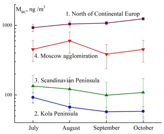 The question arises as to why the spatial MBC distribution is transformed from the summer toward the fall (see Figure 8): is this due to seasonal decrease in the black carbon content in the atmosphere of continental regions, or to decreased air transports from the territory of Europe in the direction of ocean? Clarification of the causes for the spatial MBC variations over the ocean requires a separate study, which is beyond the scope of this work. Therefore, we confined ourselves to estimates of the seasonal variations in one of the possible predictors, i.e., the black carbon concentrations in continental regions (indicated by red color in Figure 2). Most evident is the marine atmosphere, which is influenced by three coastal regions: (1) north of continental Europe, (2) Scandinavian Peninsula, and (3) Kola Peninsula. Additionally, we considered a region remote from the ocean, i.e., Region 4 (Moscow agglomeration), with a relatively high black carbon content.