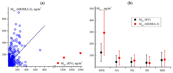 Figure 11a illustrates the regression between matched MBC values, based on the model (MERRA-2) calculations and measurements onboard the research vessel (RV). On average, the concentrations of MBC from reanalysis data are larger than from actual measurements. It can be clearly seen that three data points with very high MBC(RV) values (indicated by red color) deviate from the common regularity. Depending on whether these points are accounted for or not, the average discrepancy of the data = [MBC(MERRA) − MBC (RV)] and the correlation coefficients R strongly differ: = 26 ng/m3 and R = 0.5 for the total dataset; and = 18 ng/m3 and R = 0.28 after the three points are removed. Overestimated values MBC(RV) > 1000 ng/m3 were obtained in the North Sea basin. The causes for large MBC(RV) values in this region are difficult to determine unambiguously: either local smoke plumes from oil derricks, or from passing ships, or from industrial plants, located on the coast. Nevertheless, the results of such measurements can hardly be used for a comparison with large-scale (2° × 2°) reanalysis data, in which the local effects are smoothed out.