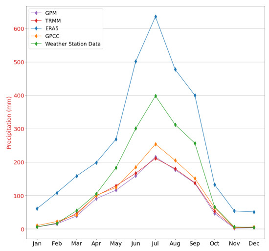 All products reflect the seasonal cycle captured in the weather station data in Figure 3, although there is large variation. Due to the resolution of the data sets when compared to the close placement of the weather stations, an exact regional comparison is not possible. Therefore, the smallest regional that encompasses the weather stations has been taken from the products and the average monthly precipitation calculated for the period 2012 to 2019. This is then compared with the average monthly weather station precipitation. As the focus of this study is monsoon change, the comparison between the data sets is primarily just within the monsoon season of June to September, and no comparison of data products is done for the winter, spring, or autumn months.