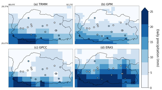 ERA5 and TRMM fit best with the weather station data in the high rainfall area along the southern plains in Figure 4a,d. GPCC records similar levels but only in the southwest (Figure 4c) and GPM underestimates precipitation. This may be due to the satellite’s poor estimation of warm orographic rains as the algorithms of both infrared (IR) or passive microwave (PM) sensors use cloud top temperature thresholds that are too cold to recognize warm orographic clouds. This was illustrated in previous studies over the USA [48] and Ethiopia [49]. In the central region, the satellite products and GPCC are closest to the observed measurements and ERA5 overestimates significantly (Figure 4d). This overestimation by ERA5 may be due again to the above-mentioned wet bias. Gasa is the only station available for comparison in the north and all products underestimate here. Although there is significant overestimation by ERA5, it is the only product to emulate the topography of the region. The two prominent valleys that propagate northward within the central region, identifiable in Figure 1, are only reflected in Figure 4d. These valleys contain slightly higher precipitation amounts than the surrounding mountainous terrain, as well as providing a route for moisture to travel northward. Therefore, they play a significant role in precipitation distribution in Bhutan.