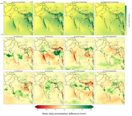 Precipitation (mm/day) during the monsoon season over the whole ISM region. Panels textbfa to textbfd show the climatology based on 1979 to 2018 JJAS data. Panels e to h and i to m show the mean monthly 2015 and 2016 difference of precipitation, respectively, calculated by subtracting the 2015 or 2016 monthly values from the 40-year climatology period.