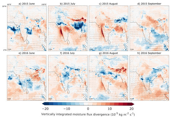 The anomaly behavior of vertically integrated moisture flux divergence (kg m s) and horizontal wind (m/s) at the 850 hPa during the monsoon seasons of 2015 and 2016. The mean monthly 2015 and 2016 difference of vertically integrated moisture flux divergence and horizontal wind is displayed for June, July, August, and September, calculated by subtracting the 2015 and 2016 monthly values from the 40-year climatology period of 1979 to 2018.