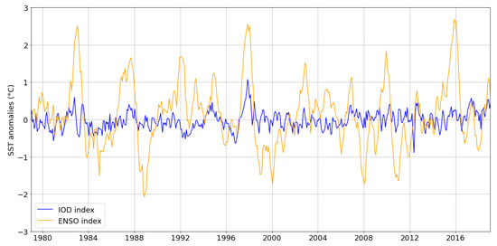 The IOD and ENSO indexes over the period 1980 to 2019. The ENSO index displays the SST anomalies for the El Nino 3.4 region in the Pacific (170° W–120° W, 5° S–5° N). The IOD index shows the SST anomalies calculated from the difference between the SSTs of the eastern area of the Indian Ocean (90° E–108° E, 10° S–0° S) and the SSTs of the western area (50° E–70° E, 10° S–10° N).