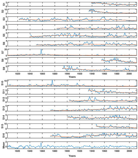Tree ring series of each tree from Campos do Jordão (Si in mm, where ). Mean chronology (Mean in mm, the last panel). The 67% nsplines (two-third splines) with 50% of frequency cutoff were applied to remove the age trend (red lines).