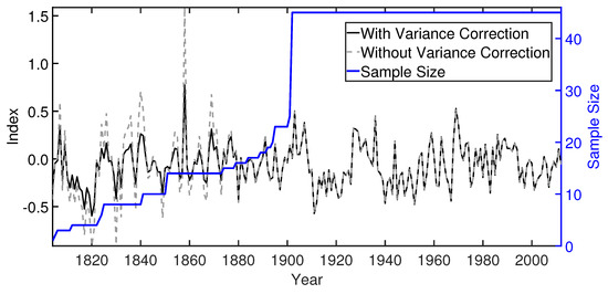 Furthermore, we performed the variance correction due to the different sample numbers used in each time interval [32]. It is important to use as much of the tree ring series as possible. A subset of size between one and ten reflects an increase in variance [33]. Given this circumstance, the variance correction should be applied to produce a corrected tree ring chronology. The uncorrected and corrected chronologies are shown in Figure 4. In our case, there was a contraction in the variance of the corrected chronology below 15 samples.