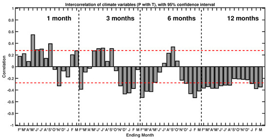 Intercorrelation of the climatic variable (precipitation and temperature) for 1, 3, 6, and 12 month-period moving correlation.