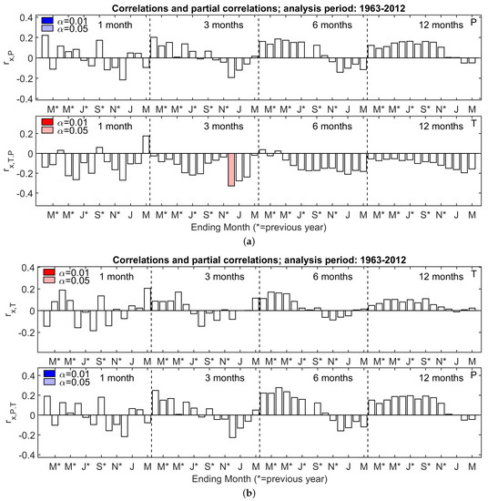 Correlations (top panel) and partial correlations (bottom panel) of mean chronology with the precipitation (P) and temperature (T). In each top panel are the simple correlations with the primary climate variable, and in each bottom panel, the partial correlations of mean chronology with the secondary climate variable. Significance at = 0.05 and = 0.01 color-coded. Notation () means correlation of x (mean chronology) with P (T); () means partial correlation of x with T (, controlling for influence of P (T). (a) Top—Precipitation simple correlation. Bottom—Temperature partial correlation. (b) Top—Temperature simple correlation. Bottom—Precipitation partial correlation.