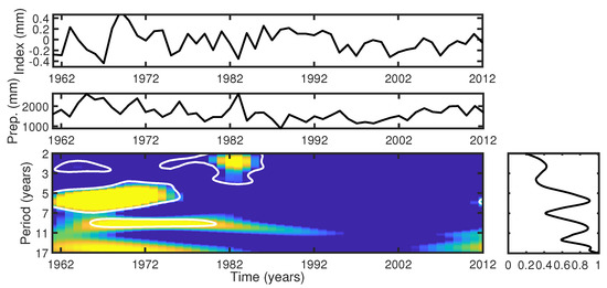 Cross-wavelets between the average growth rings’ dendrochronological series and February precipitation time-series with the global spectrum (bottom right panel) and the confidence level of 95% (white contours).