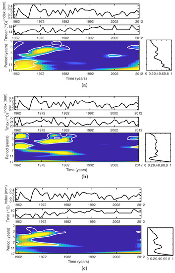 For the full period, the highest correlation using temperature as a primary climate variable is 0.21 for March (Table 3). In the same sense, the results for the halves of 1963–2012 are 0.36 and 0.02, respectively. This low correlation between the tree ring series and monthly temperature in the late period once more suggests caution in climatic reconstructions. The indicates that the parameters used in this analysis are not significantly correlated with the full period. Figure 9a shows the influence of the mean temperature, especially around the 3–7 year band during ∼ 1964–1983, and an 8–17 year band during 1962–1969. In Figure 9b, we can verify three bands of maximum temperature influence, a 2–3 year band during ∼1961–1967, a 4–7 year band during 1961–1968, and a 2–5 year band during 1968–1987. Finally, in Figure 9c, we can verify only one band of minimum temperature influence, a 4–9 year band during ∼1961–1981.