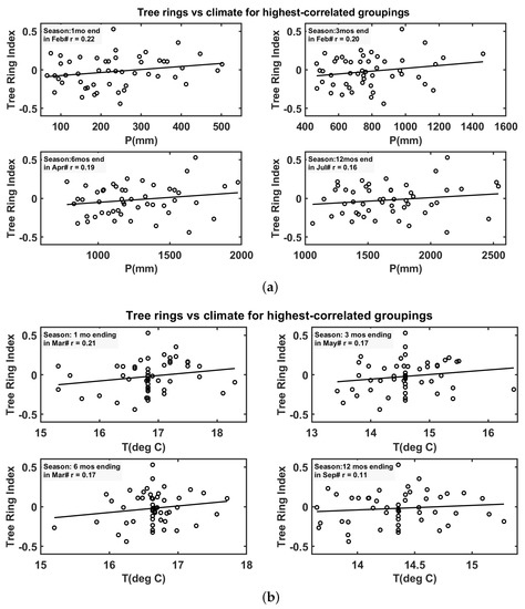 Trees are used as a natural record of climate variability in the regions in which they grow. The study of the climate–time relationship using the variation in the width of the tree ring growth is known as dendroclimatology. By analysing the tree ring widths, it is possible to access how the trees responded to the regional climatic conditions. There are many studies that prove this growth variation response [1,2], and it can vary from species to species. Dendroclimatology determines the age of the trees by measuring the growth of tree rings formed year by year and establishes its relationship with climatic events [3]. This technique extracts the memory of climatic variations of the environment recorded by their tree ring widths [4].