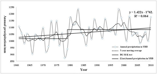 By using the BG abrupt change test for the annual rainfall in the YRB from 1961 to 2010 (Figure 2), we found that the annual rainfall amount in the YRB changed significantly in 1979 (with a significance test result of 0.05), and the average annual rainfall from 1980 to 2010 was 68.9 mm higher than that from 1961 to 1979.